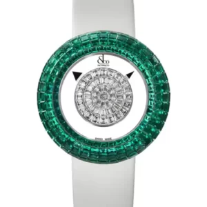 Bộ vỏ thép không gỉ với kích thước 44 x 53,7 mm chỉ được lộ ra ở mặt sau. Ở đây, chúng ta có thể thấy được tên thương hiệu cùng với slogan quen thuộc của Franck Muller “Master of Complication”, bên cạnh đó là mã hiệu và số Serial của chiếc đồng hồ. Những mốc giờ là những chữ số Ả Rập được thiết kế theo phong cách Art Deco và khảm kim cương làm tăng vẻ hào hoa, quý phái. Ở góc 6 giờ là một ô cửa sổ nhỏ hiển thị ngày.